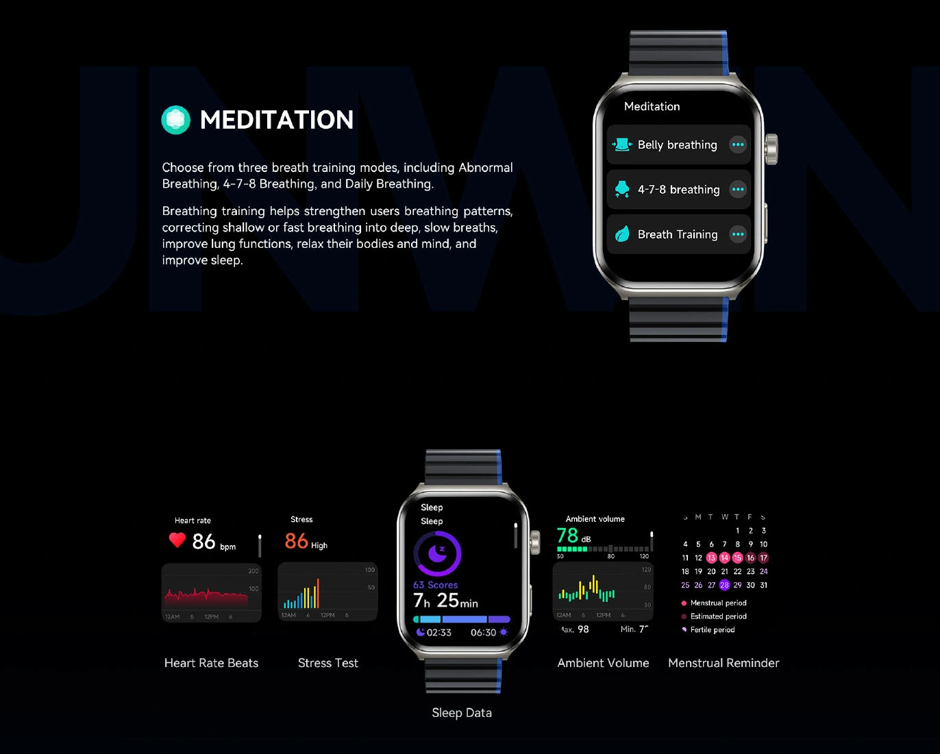 این ساعت هوشمند دارای سنسورهای پایش سلامت است که میتوانند ضربان قلب، سطح اکسیژن خون (SpO₂) و کیفیت خواب شما را در طول روز ثبت و گزارش دهند. پایش ضربان قلب بهصورت لحظهای انجام میشود تا بتوانید وضعیت فعالیت قلب خود را بررسی کنید، و سنجش اکسیژن خون کمک میکند تا از سلامت تنفسی خود نیز آگاه شوید. همچنین قابلیت پایش خواب به شما این امکان را میدهد تا الگوی خواب سبک و عمیق، مدت زمان استراحت و کیفیت کلی خواب خود را تحلیل کنید و به بهبود عادات خواب کمک کنید.